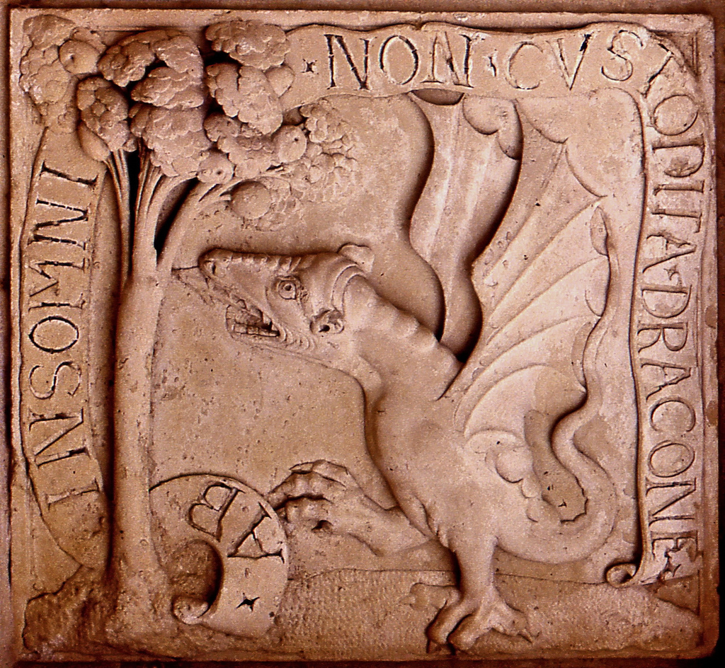 Así reza uno de los bellos artesones del castillo de Dampierre que Fulcanelli estudia en «Las moradas filosofales». En el artesón vemos a un dragón con aspecto extraño, parece poco peligroso, es pequeño, y le ruge a un árbol con frutos… pero no nos dejemos engañar porque su lengua de fuego puede quemar todo alrededor. Aun con esa pinta rara y sus dos únicas patas, queda clara su fuerza por el grosor del cuello, sus alas membranosas, sus dientes y sus garras afiladas, y esa lengua en forma de flecha. Este ser es el guardián de las cosas que importan, de lo que tiene valor, y no solo, quizás, valor material. Fuera del dragón insomne, las cosas no están custodiadas… solo el dragón que no duerme guarda bien los tesoros.