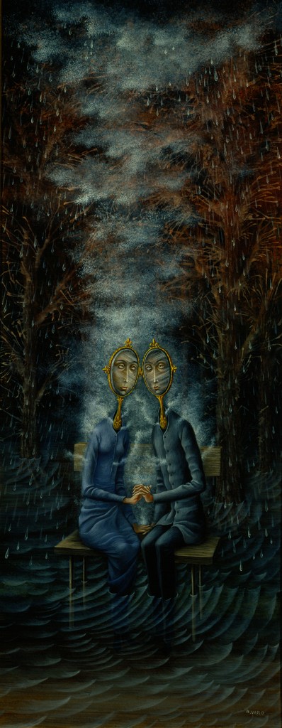 La imagen que ilustra esta entrada es un fragmento del impresionante cuadro de Remedios Varo llamado «Los amantes», pintado por la artista en 1963. Aquí lo pego completo, porque valen la pena el formato y los detalles.