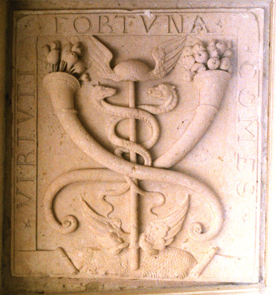 El dios griego Hermes (el Mercurio romano) utilizó su bastón para separar a dos serpientes que se encontraban enzarzadas en una lucha a muerte, quedando luego esa vara con las dos serpientes enroscadas simbolizando los dos principios contrarios de la Alquimia -azufre y mercurio-, y también identificando al propio dios Hermes. Y es el símbolo que, precisamente, permanece y todavía hoy identifica a muchas farmacias, con una o dos serpientes, y con la copa ocupando el lugar del caduceo.
