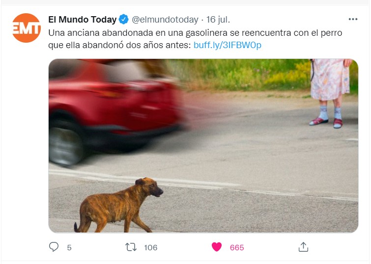 Hoy he visto esto en Twitter. Me ha hecho reír, claro, porque en El Mundo Today son buenos en sacarte unas risas. Pero también me ha parecido que, a su manera, retrataban una triste realidad: la del abandono. Y en España somos líderes en eso, lamentablemente, en toda la Unión Europea, con 700 animales abandonados al día. 29 cada hora.